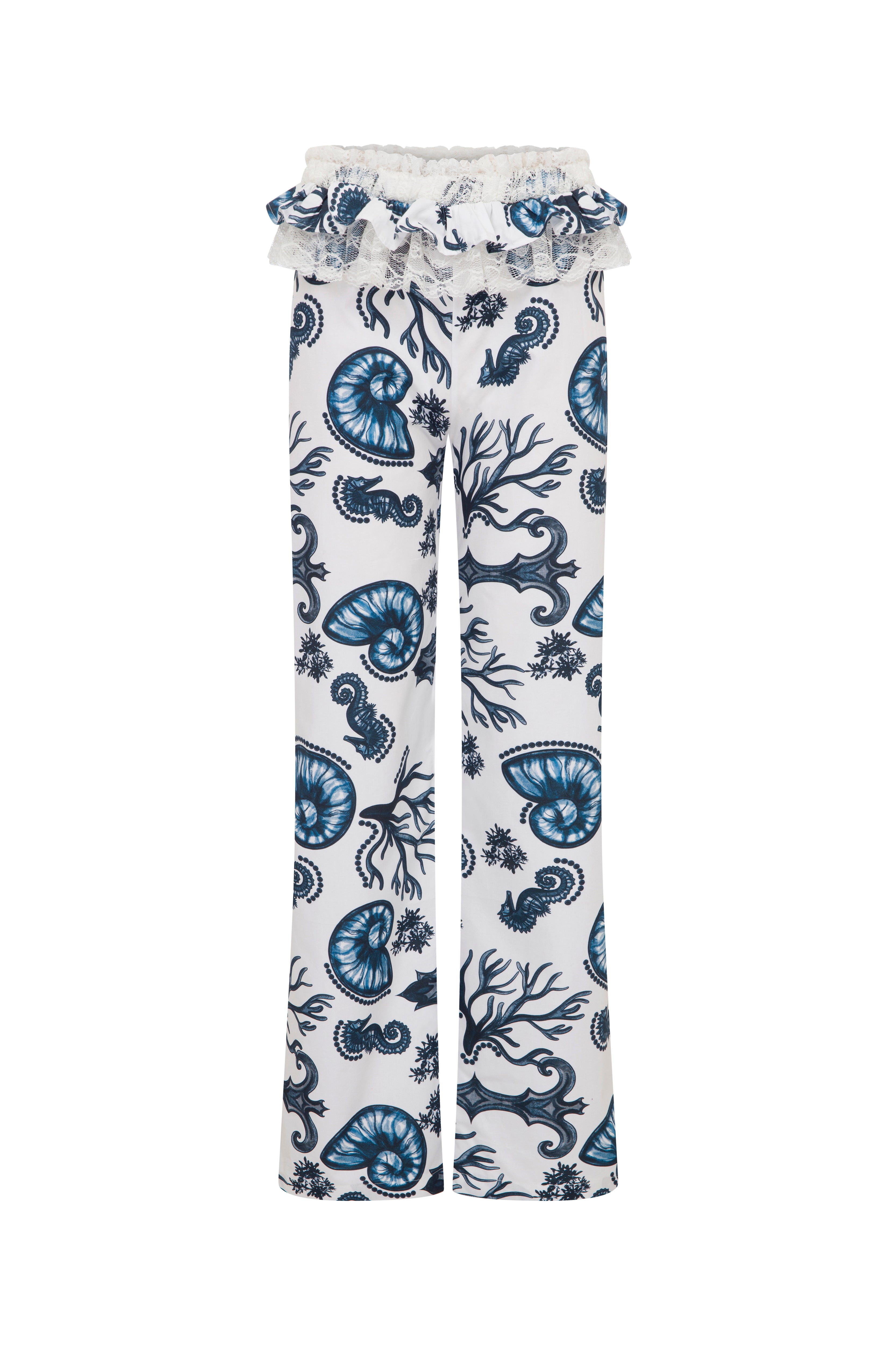 Yaz esintili bu %100 pamuklu vual pijama takımı, midye kabuk deseni ve bel ile yakadaki dantel fırfır detaylarıyla hem rahat hem zarif. Nefes alabilir yapısıyla ideal konfor sunar.